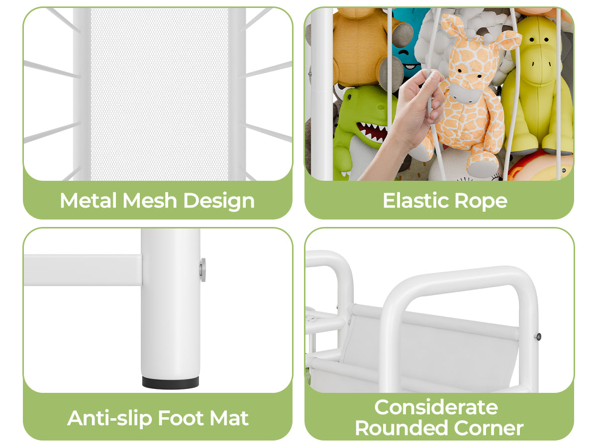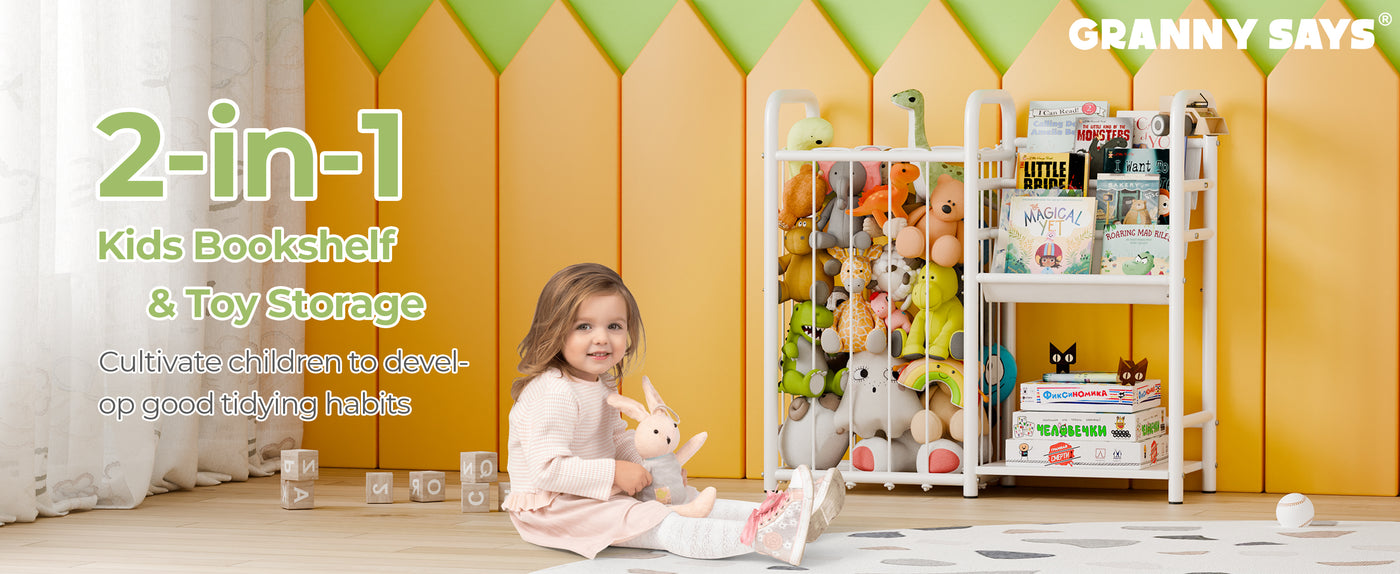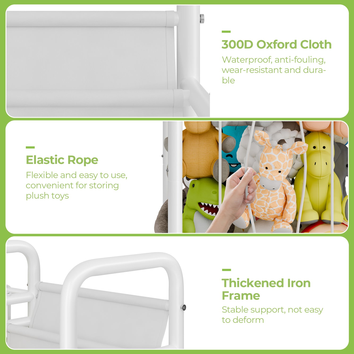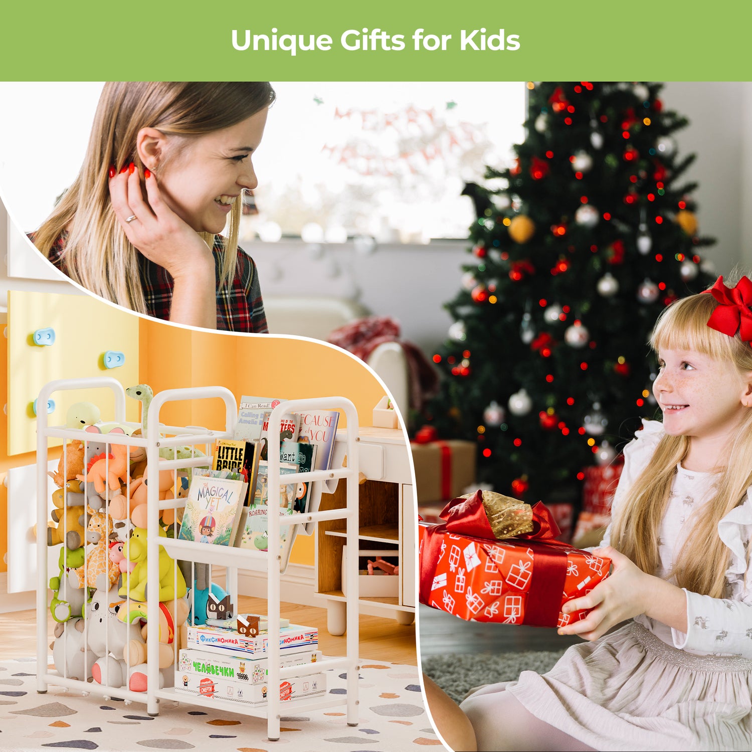 3-in-1 Multifunctional Bookshelf: Combines plush toy storage, a bookshelf, and a tiered rack. Perfect for storing toys, books, and more.