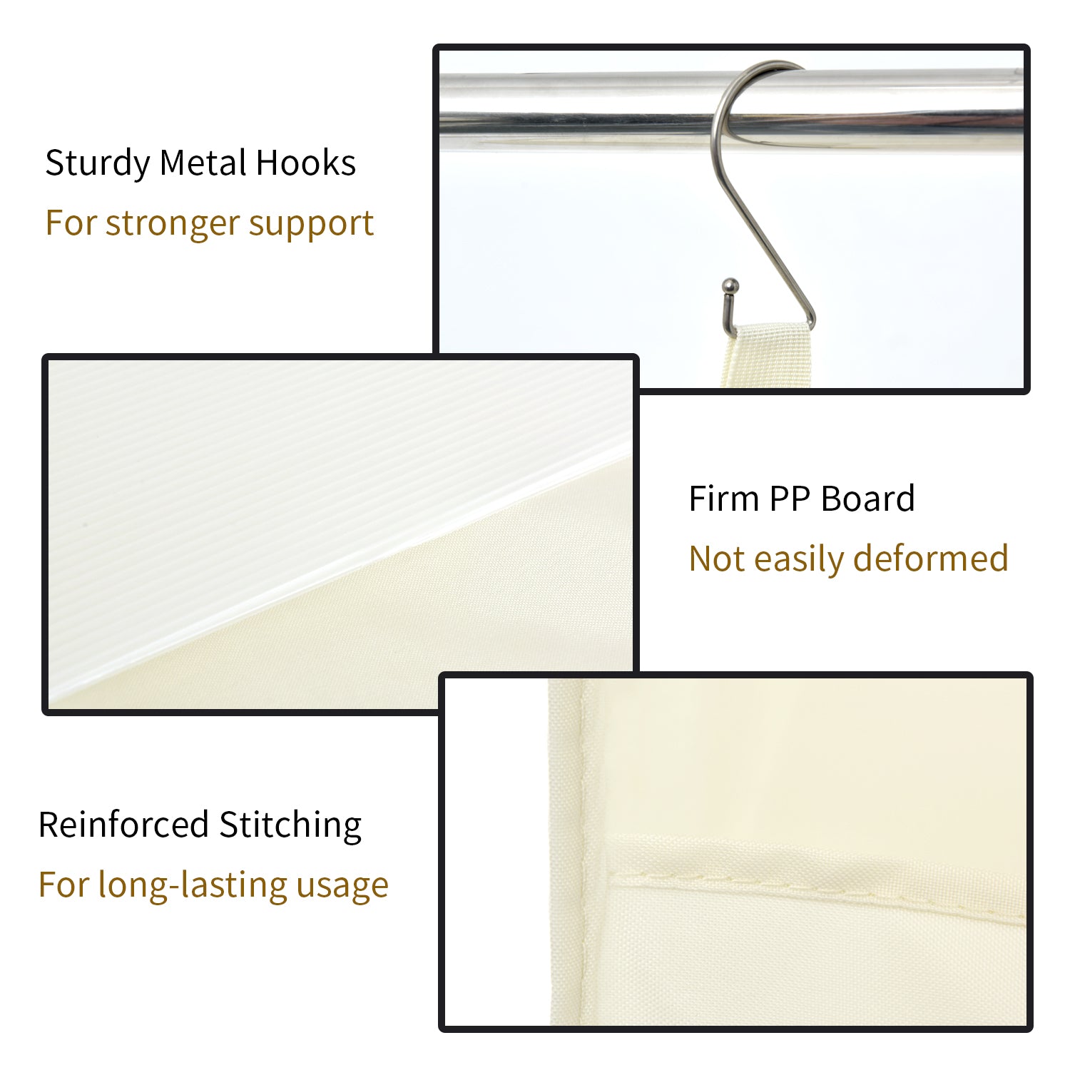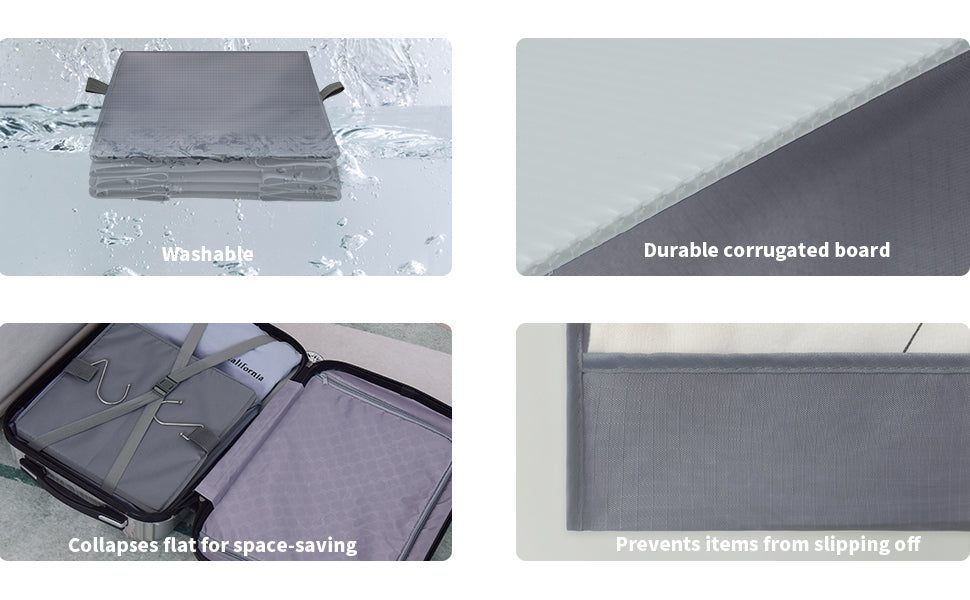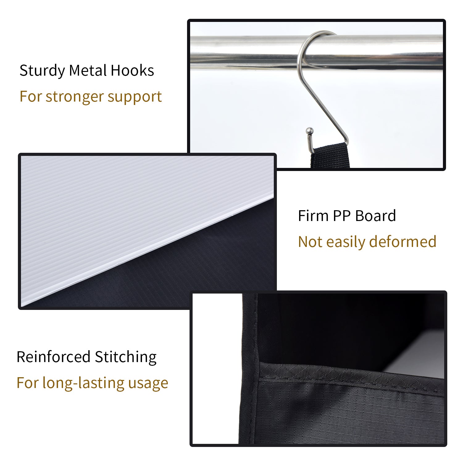 Crafted from lightweight, durable, and washable polyester fabric, each shelf features a removable board to support heavier items like clothes, towels, hats, shoes, and accessories. The leak-proof strip design on the front of each shelf keeps your belongings secure and prevents slipping.