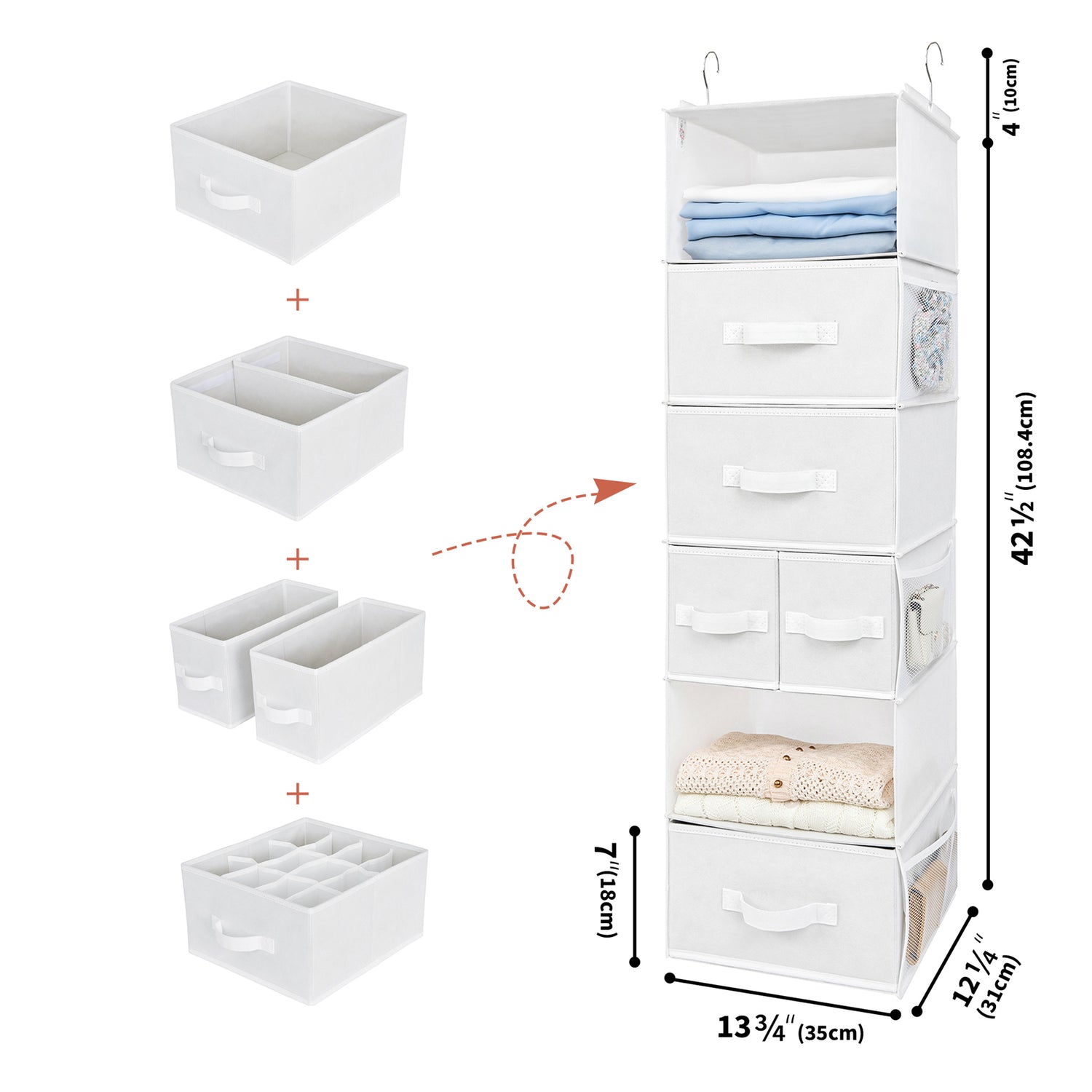 GRANNY SAYS 6-Shelf Hanging Closet Organizer measures 12¼"L x 13¾"W x 42½"H and features 5 different removable drawers for versatile storage: