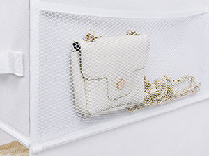 Additionally, the organizer includes 6 mesh side pockets designed for small items such as purses, bags, towels, ties, belts, and jewelry — easy to access and space-saving.