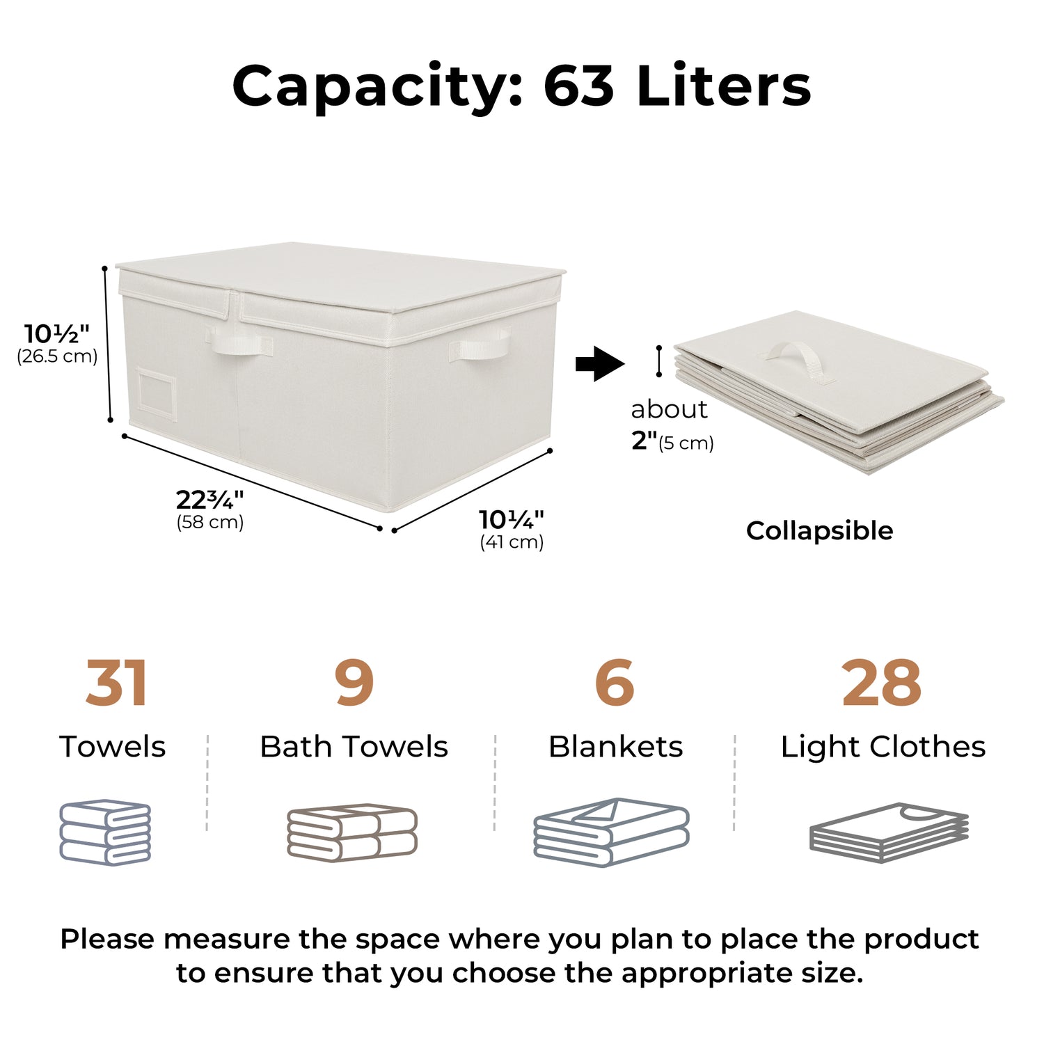 Organize in style with the GRANNY SAYS Jumbo Fabric Storage Bin with Lid. Measuring 22¾" L x 16¼" W x 10½" H, this extra-large box offers a spacious 63L capacity, perfect for clothes, bedding, toys, seasonal items, and more.