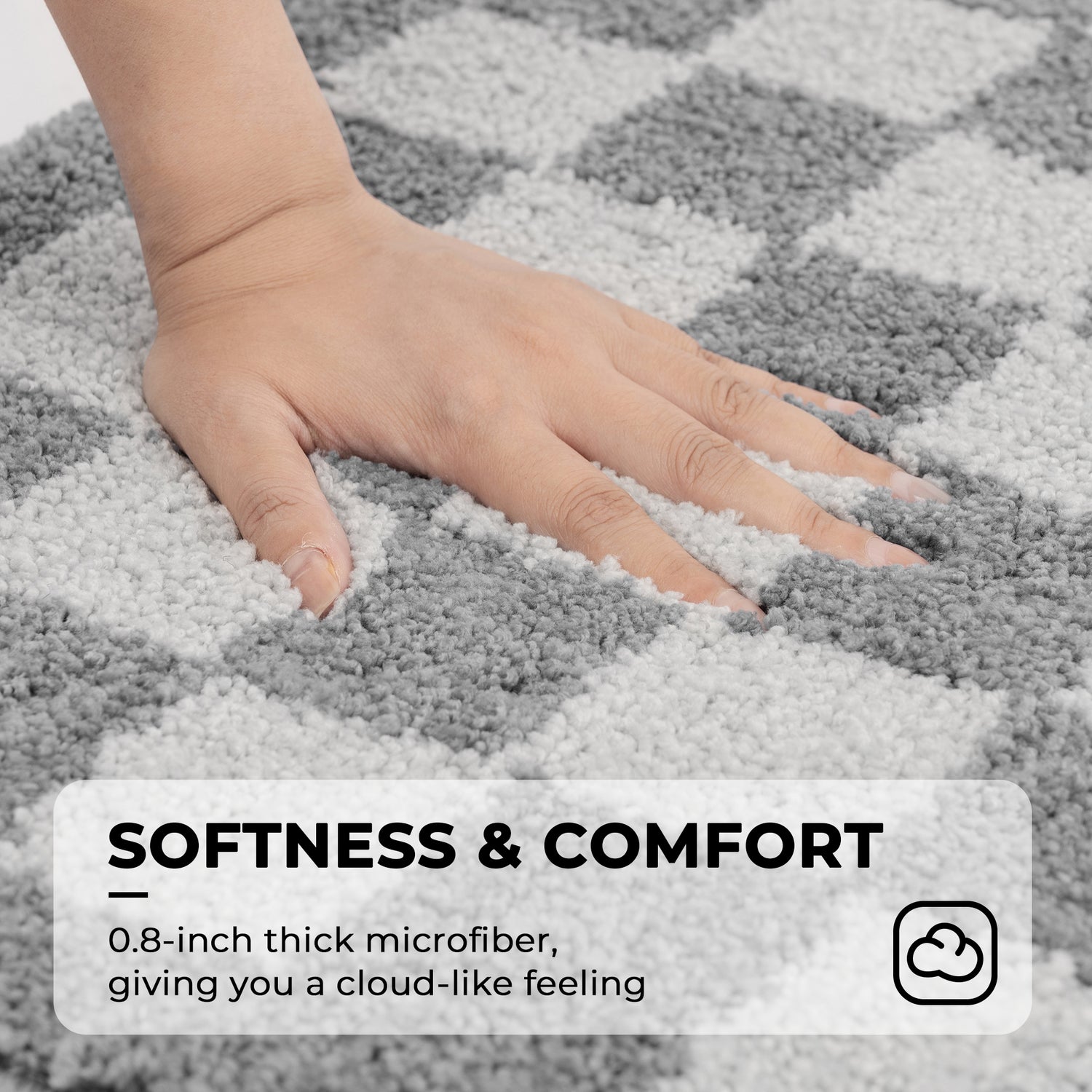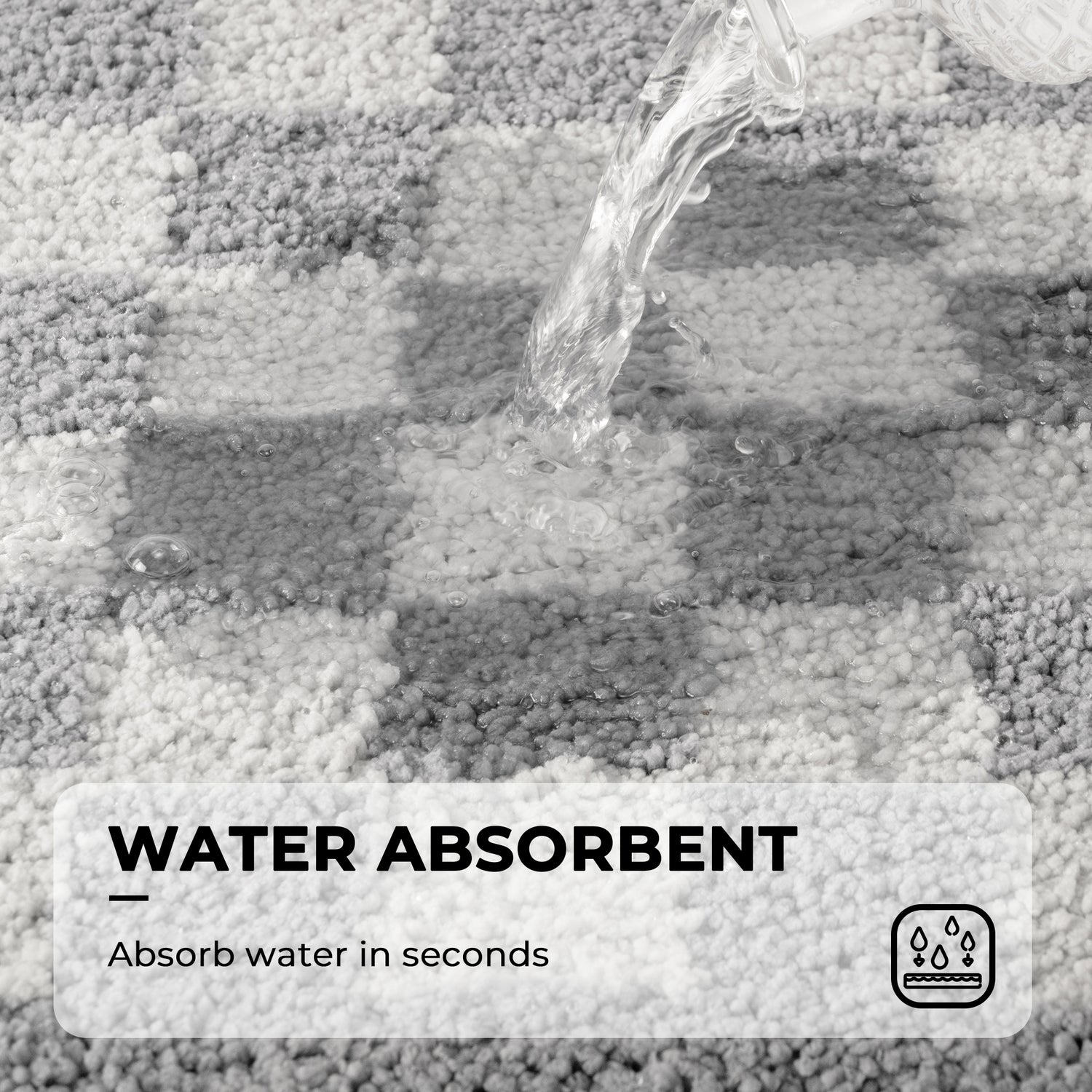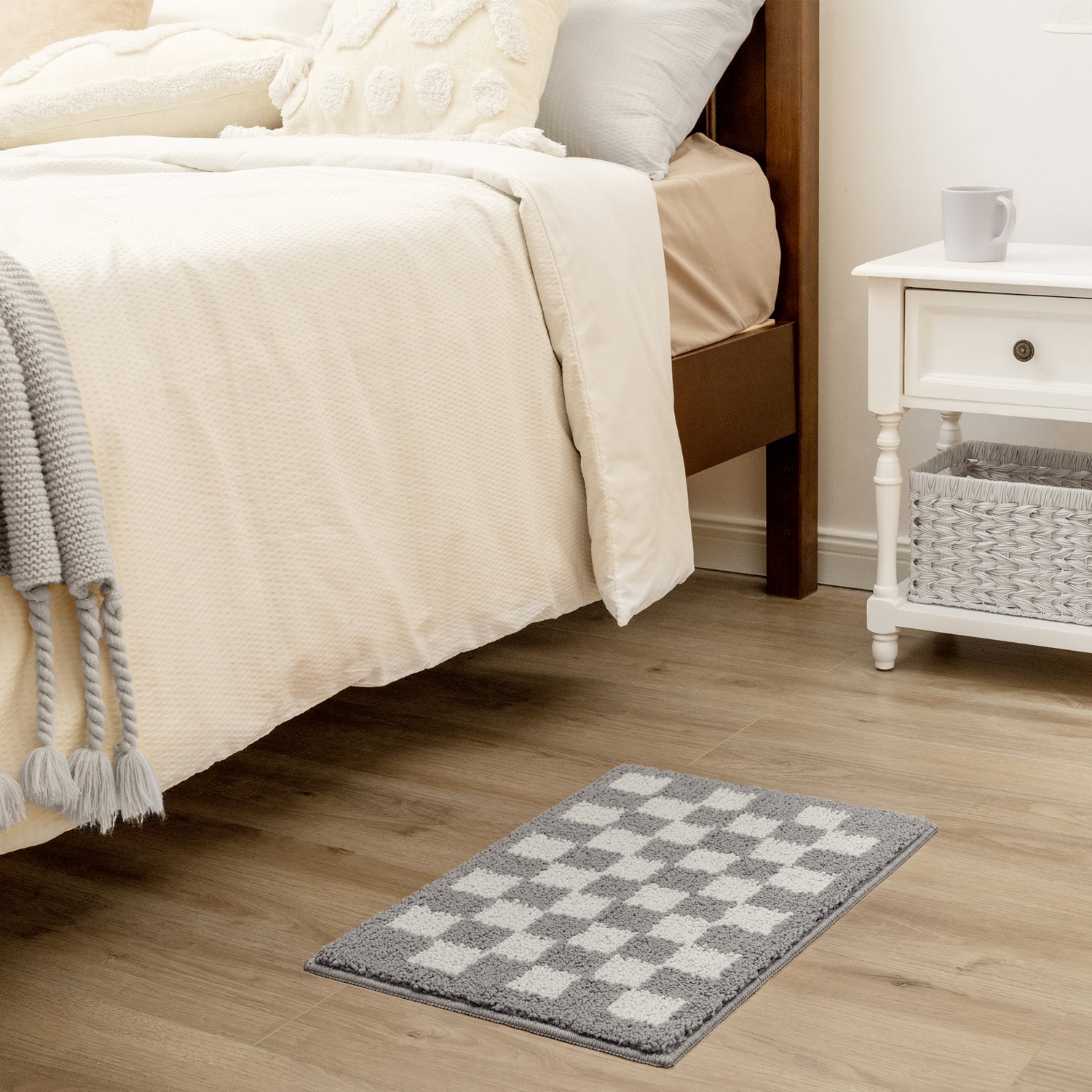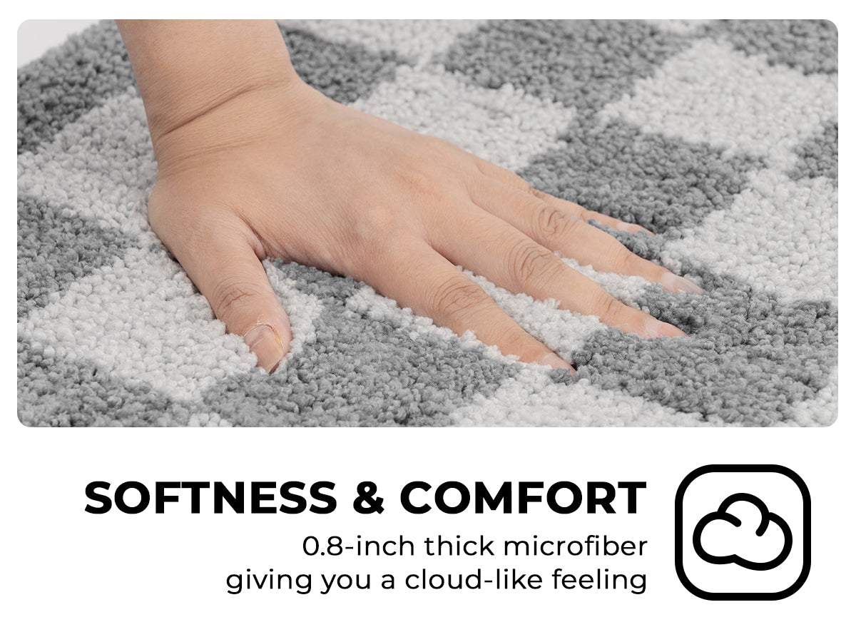 Add timeless style and cozy comfort to your space with this grey checkered bathroom rug. Its high-density microfiber is plush and ultra-soft, providing cloud-like comfort with every step. The thick fibers quickly absorb water, keeping your floor clean and dry.
