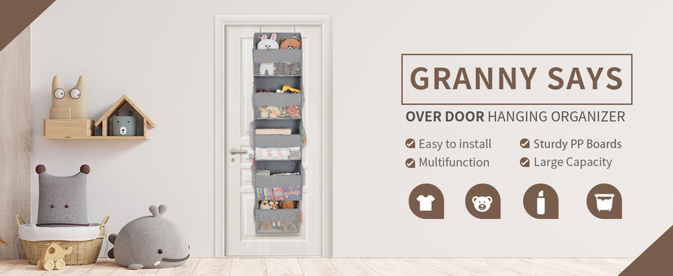GRANNY SAYS Over The Door Organizer measures 13"L x 6¼"W x 57"H, featuring 5 large compartments and 8 mesh side pockets for versatile storage of toys, diapers, clothes, towels, bags, yarn, socks, and more.