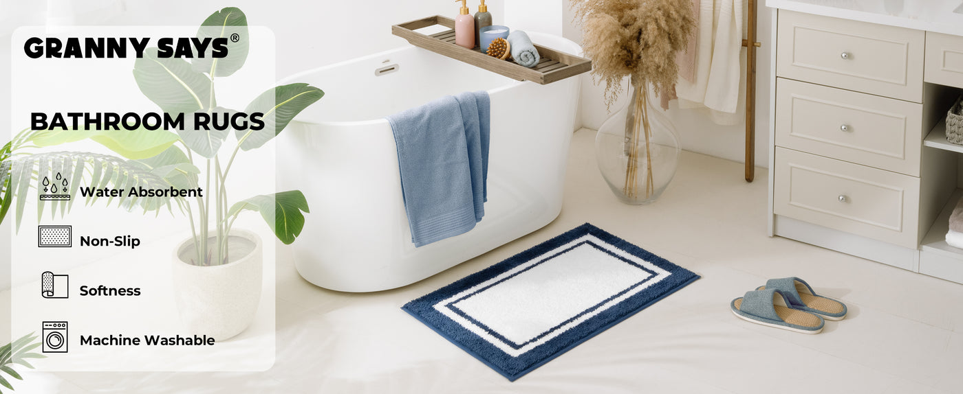 Our luxury blue microfiber bathroom rugs bring a fresh, elegant look with a geometric border design. These plush, soft bath mats rapidly absorb water to keep your bathroom floors dry and safe. Equipped with non-slip rubber backing, they stay securely in place. Machine washable and durable, these washable bath rugs keep their rich color and softness wash after wash.
