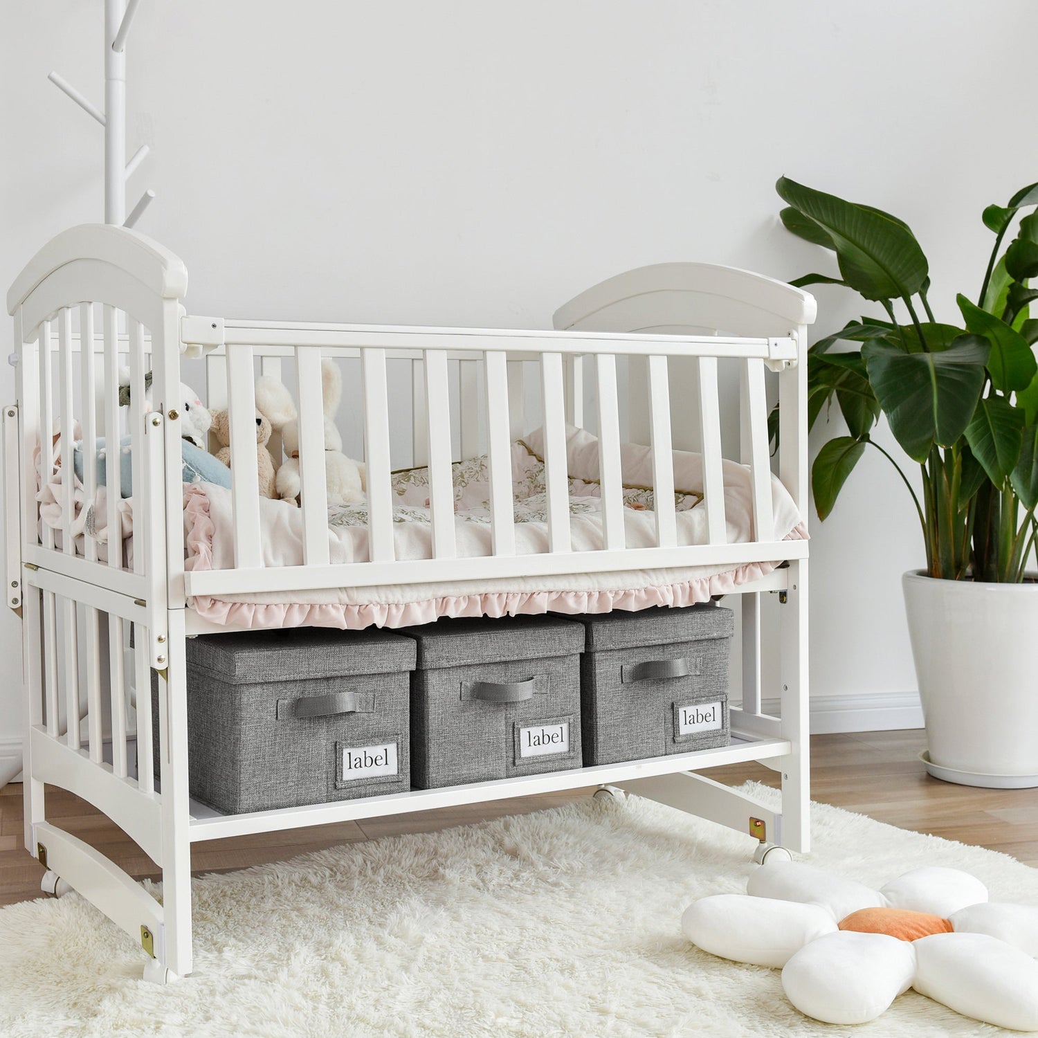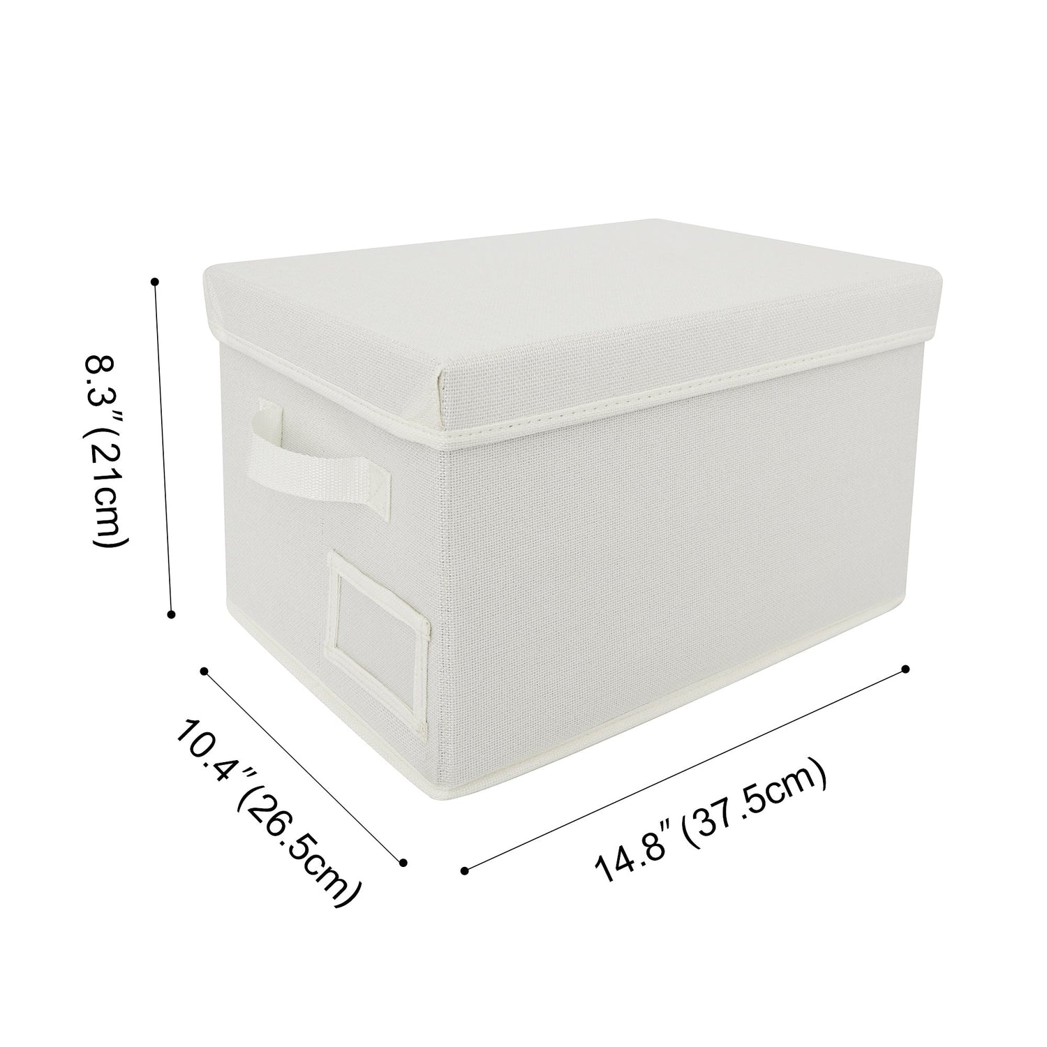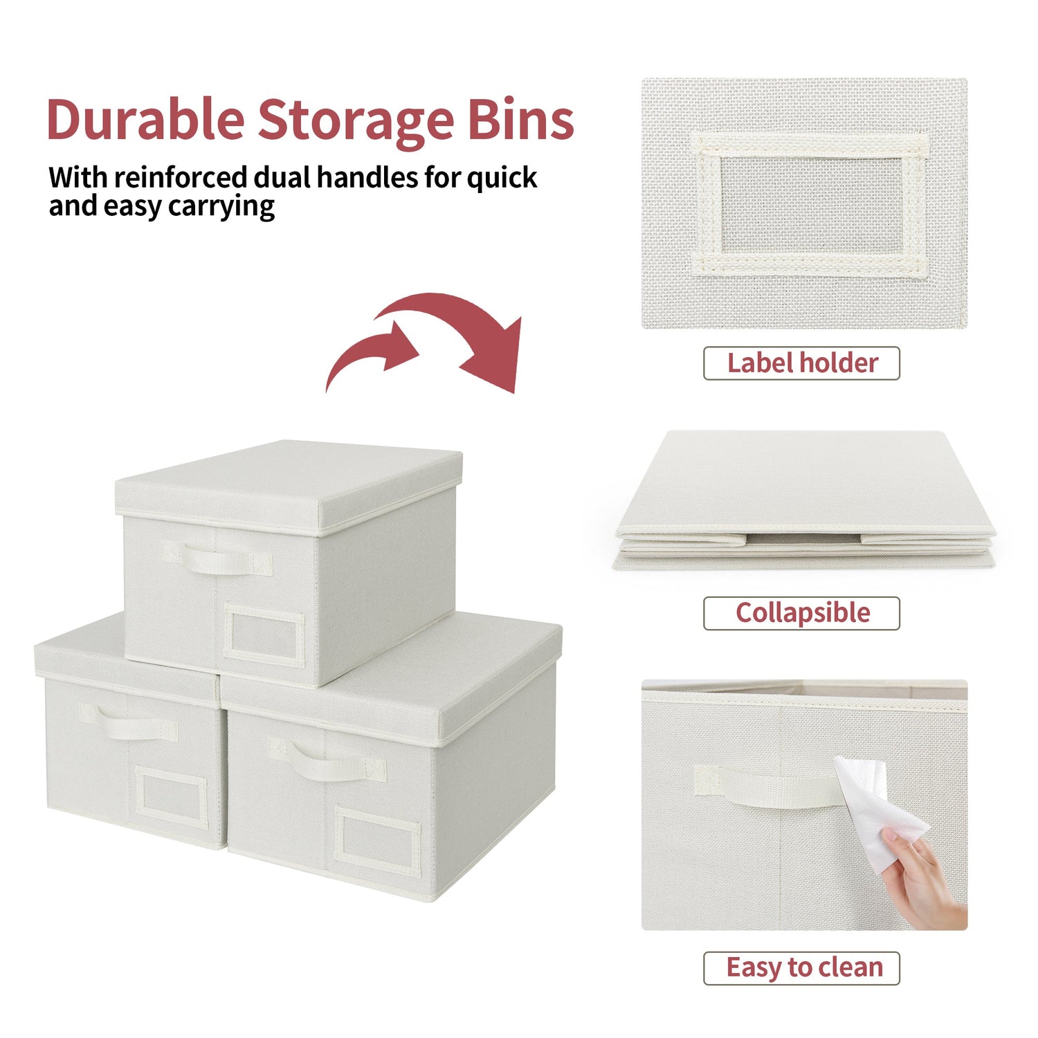 Each bin features sturdy handles on both sides for easy carrying and integrated label holders for quick identification of contents. The heavy-duty thick cardboard edges, reinforced base, and lid make these storage containers stackable, helping you maximize vertical space while keeping your area neat.