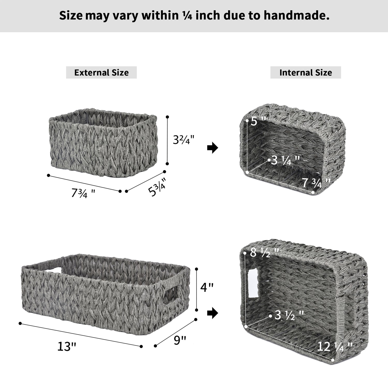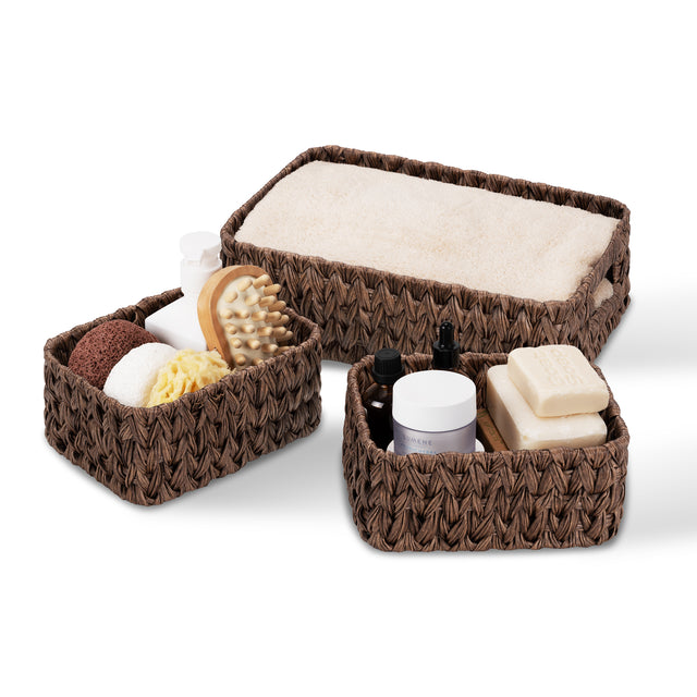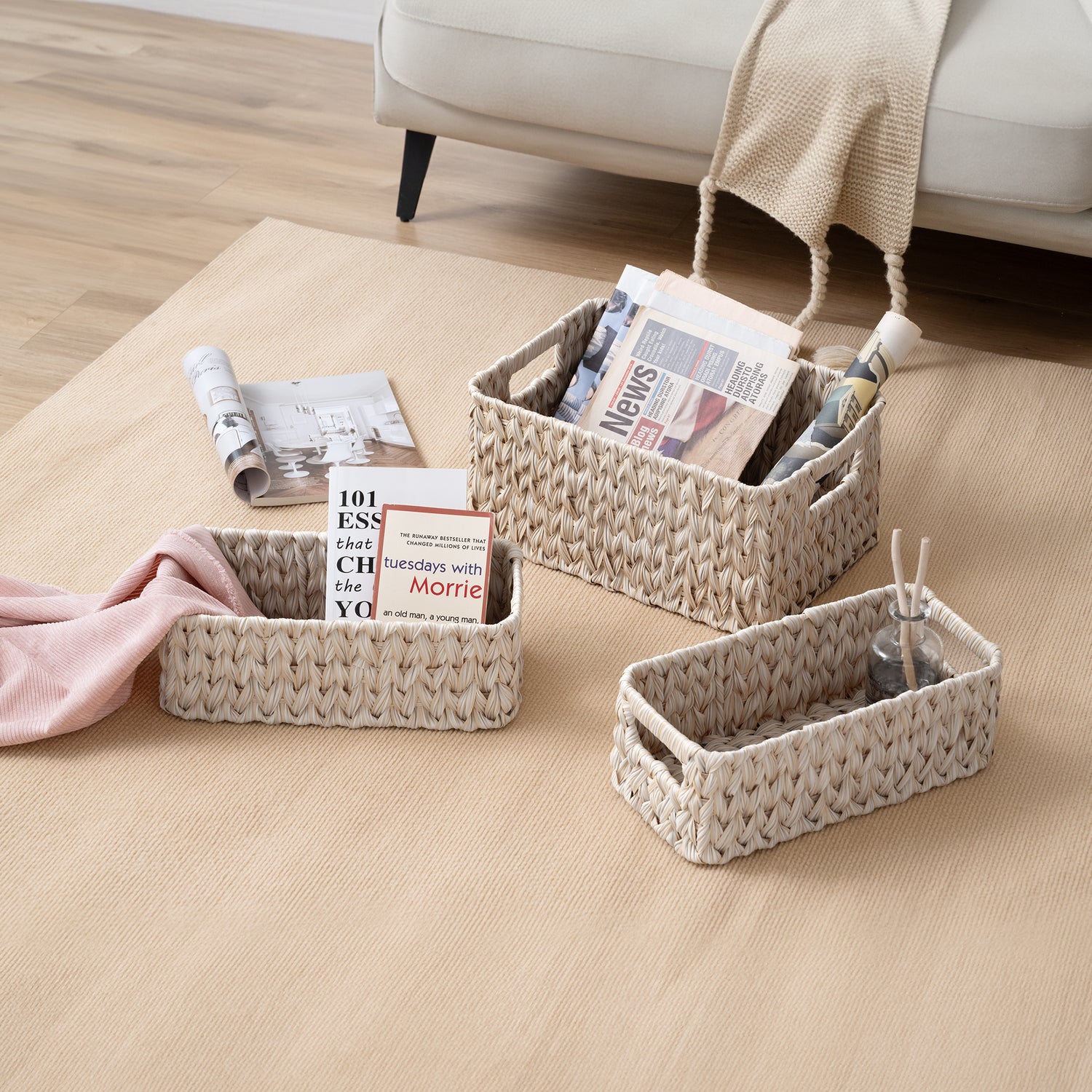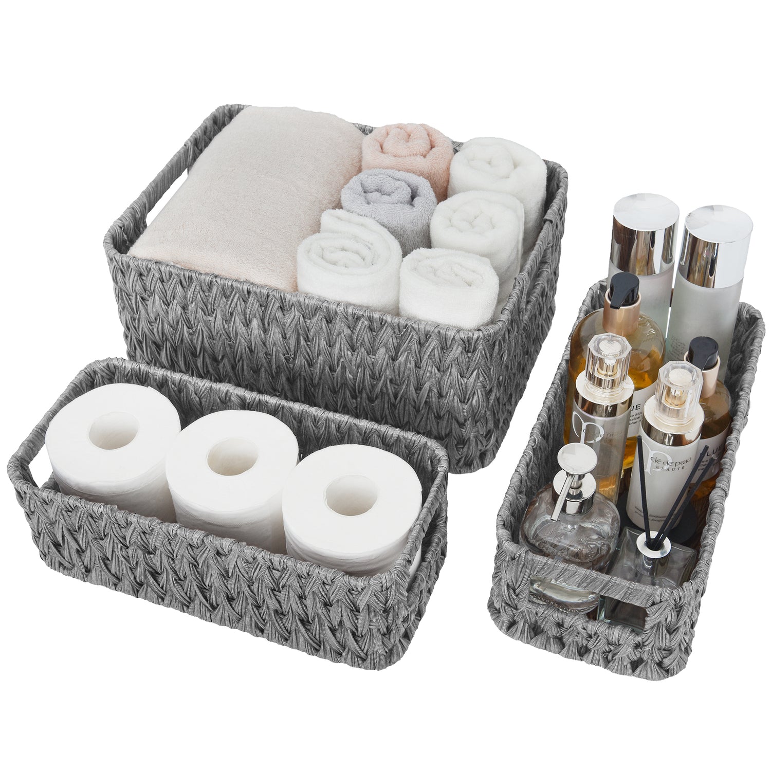 • 1 larger basket and 2 smaller baskets offer versatile storage for various items like toilet paper rolls, towels, and toiletries in the bathroom.